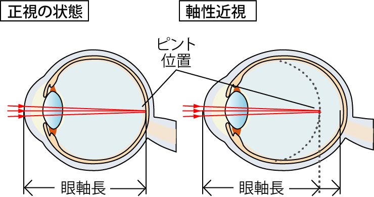 子供の近視は、主に眼球が楕円状に伸びてしまう(眼軸長が伸びる)ことで、ピントの位置がずれることによって生じます。近くを見ることが習慣化してしまうと近視になりやすく、一度眼軸長が伸びてしまうと戻ることはありません。そのため、眼軸長の伸びを抑えることが、近視の進行を抑制するためには重要となります。