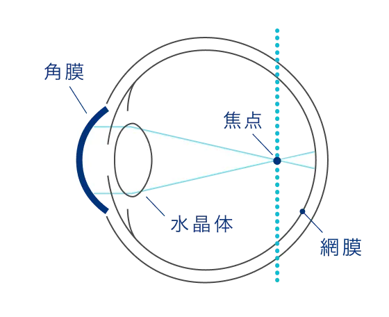 目は入ってきた光を角膜と水晶体で屈折させて、網膜上で焦点を合わせることにより像として捉えます。近視の場合は、この焦点が網膜より手前で結ばれるために像がぼやけて見えます。