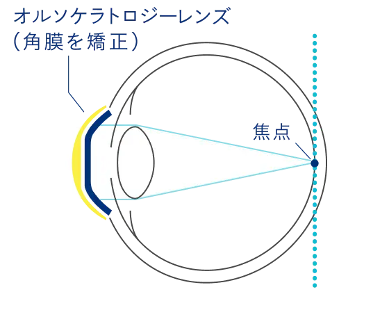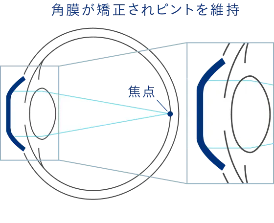 レンズを就寝時に装用することで、角膜前面の形状が平坦化し、焦点が網膜上で結ばれて近視が矯正されます。